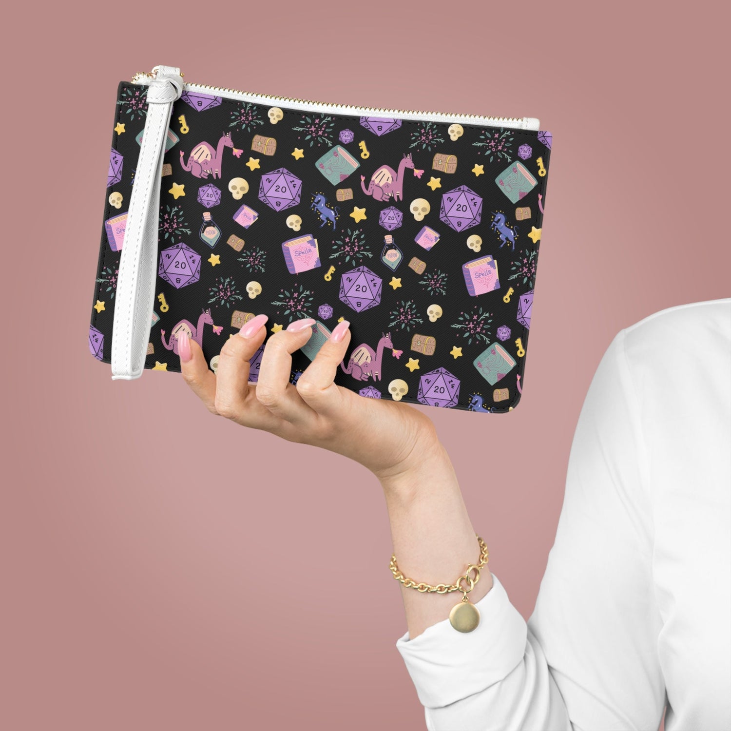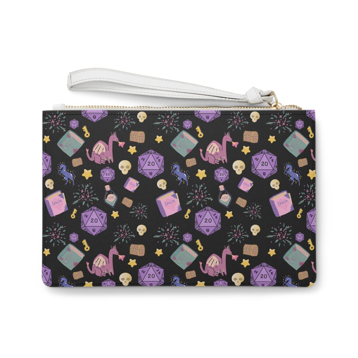 Designed with a loop handle to quickly free your hands, this custom fantasy-style clutch bag is made for the gaming fashionista on the go. It can hold everyday essentials such as a phone, wallet, and keys. It features a zip fastening and a fully lined internal pocket. It is made of vegan leather.